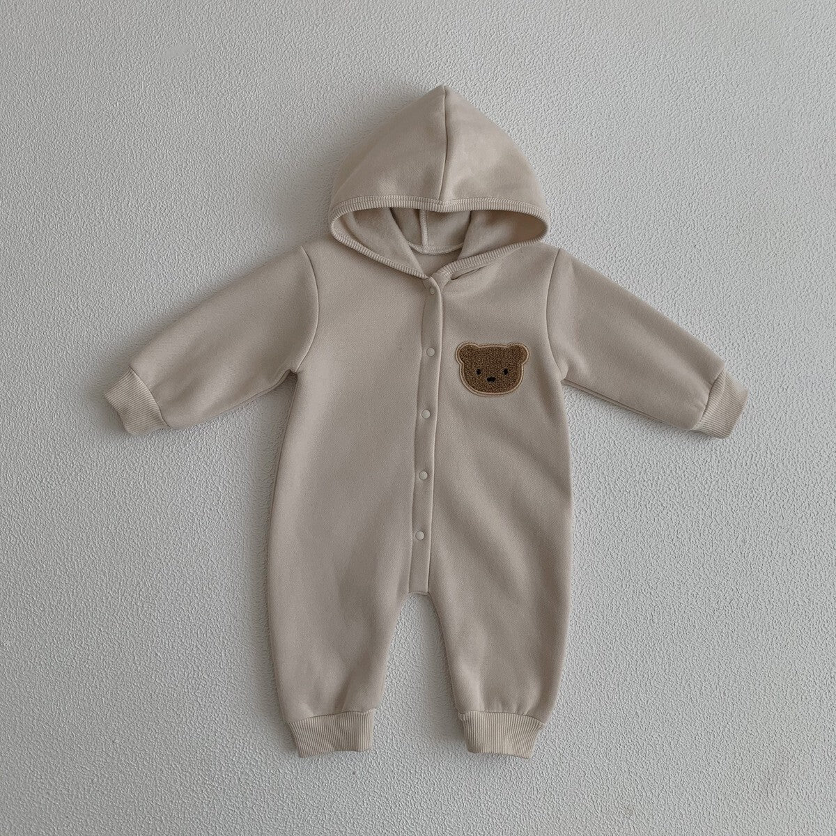 Die kuscheligen Einteiler sind aus warmem Fleece gefertigt und bieten Ihrem kleinen Schatz optimalen Komfort für kühle Tage. Der Strampler ist mit einer praktischen Kapuze ausgestattet und verfügt über eine niedliche Bären-Applikation auf der Brust, die dem Outfit eine verspielte Note verleiht. Die Druckknopfleiste vorne ermöglicht ein müheloses An- und Ausziehen. Die elastischen Bündchen an Ärmeln und Beinen sorgen dafür, dass alles schön an Ort und Stelle bleibt. Das schlichte, geschmackvolle Design in neutralen Farben macht diese Strampler zu einem vielseitigen Bestandteil der Babygarderobe. Perfekt geeignet für den Alltag, gemütliche Kuschelstunden oder als besonderes Geschenk zur Geburt.