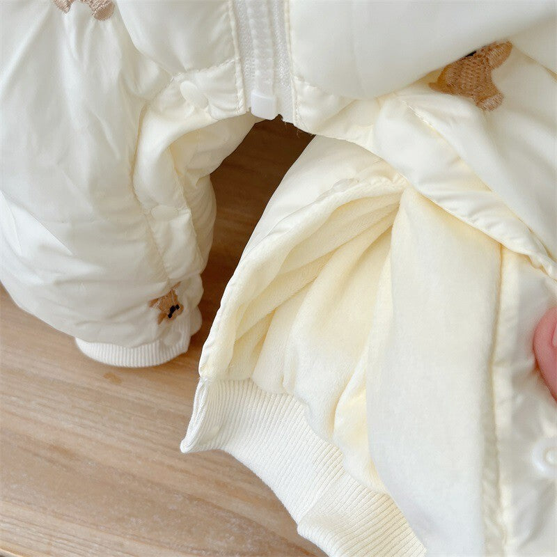 Dieser entzückende Baby-Schneeanzug vereint Wärme und Stil in einem kuscheligen Winteroutfit. Der cremeweiße Overall ist mit niedlichen Bärenmotiven verziert und verfügt über eine bezaubernde Kapuze mit flauschigen Bärenohren. Die weichen Plüschdetails in Beige an Ärmeln, Kapuze und der aufgesetzten Tasche mit 'Bear'-Schriftzug machen diesen Strampler besonders charmant. Der durchgehende Reißverschluss ermöglicht ein einfaches An- und Ausziehen, während die elastischen Bündchen an Armen und Beinen die Wärme optimal bewahren. Der Jumpsuit ist ideal für kühle Tage und eignet sich perfekt als Geschenk zur Geburt oder als Teil der Wintergarderobe für Babys. Das weiche Material und die hochwertige Verarbeitung sorgen für optimalen Tragekomfort. Ein praktisches und zugleich stylisches Kleidungsstück, das Ihr Baby warm und gemütlich hält.