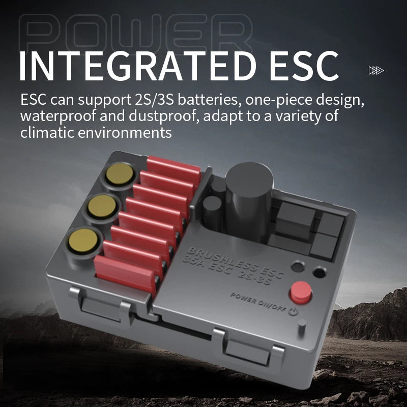 ESC can support 2S/3S batteries, one- piece design, waterproof and dustproof, adapt to a variety of climatic environments